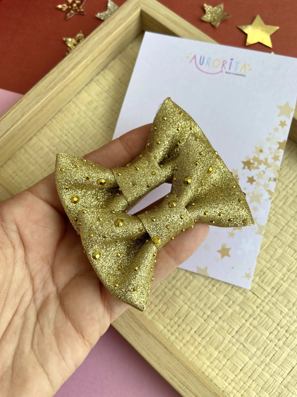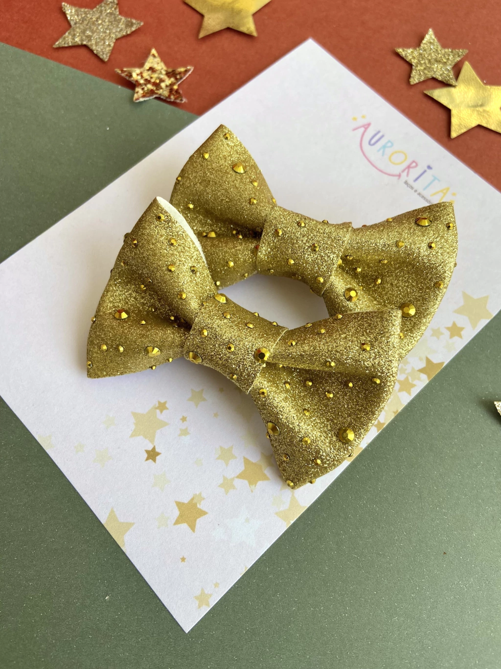 Encante sua pequena com o charme irresistível do Par Dourado com Strass! Com cerca de 7 cm, esses laços são o toque perfeito para compor o look de Natal, trazendo brilho e sofisticação para as ocasiões especiais.