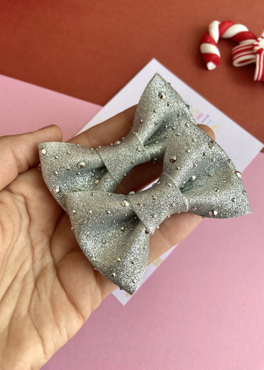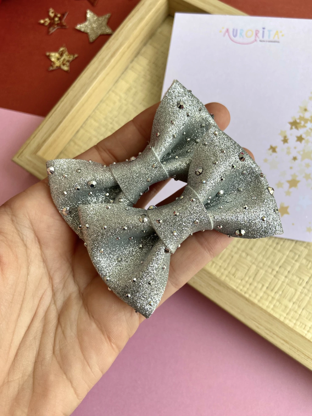 Encante sua pequena com o charme irresistível do Par Prata com Strass! Com cerca de 7 cm, esses laços são o toque perfeito para compor o look de Natal, trazendo brilho e sofisticação para as ocasiões especiais.