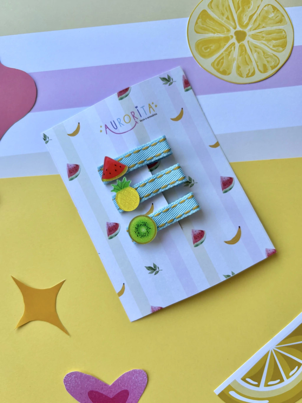 Conheça nosso encantador Trio de Clips de Frutinhas Fofo! Feitos à mão com muito carinho, esses clipes são ideais para dar um toque divertido e colorido ao visual da sua pequena.